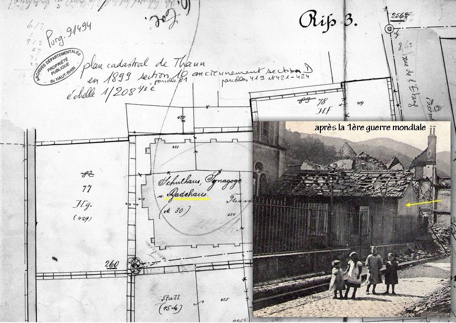 Nous avons également trouvé un texte attestant que la Synagogue et la Maison des Bains avaient été endommagés par des tirs d' artillerie pendant la Première Guerre Mondiale ( voir plan + carte ci-dessous - cotes archives : AL 059119 et 059542 )