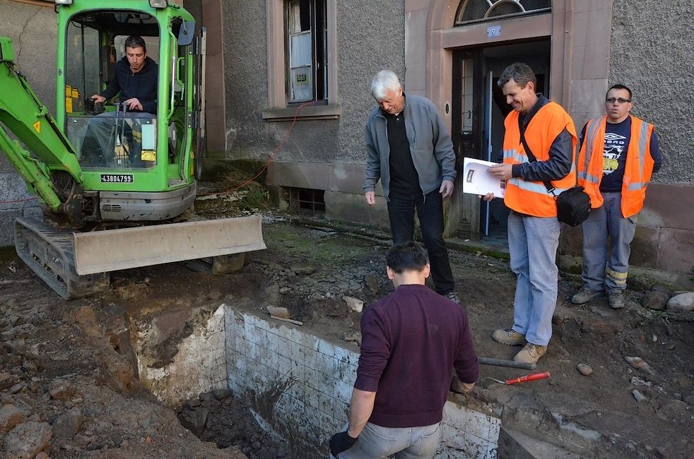 Le 17 mars 2014, après quelques coups de pelleteuse, on a vu apparaître des carreaux qui recouvrent des parements en grès ..... à suivre